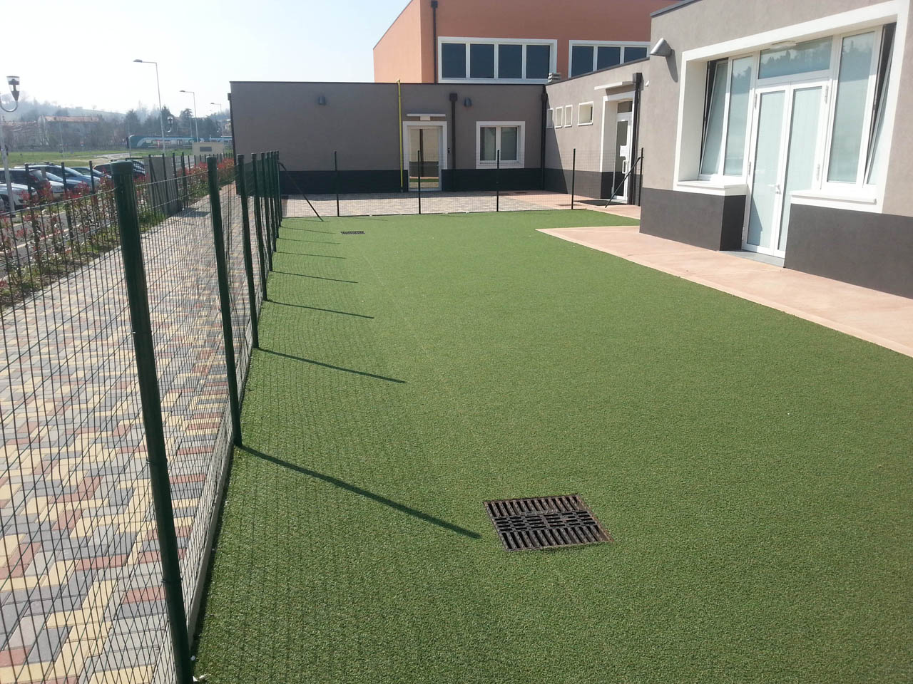A completamento dell’intervento, abbiamo rinnovato il giardino esterno della scuola mediante la posa di erba sintetica effetto naturale. Questo materiale: